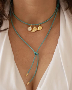 Colar Amarração Fio Verde com Pingentes Concha Peixe e Pérola - Banhado a Ouro
