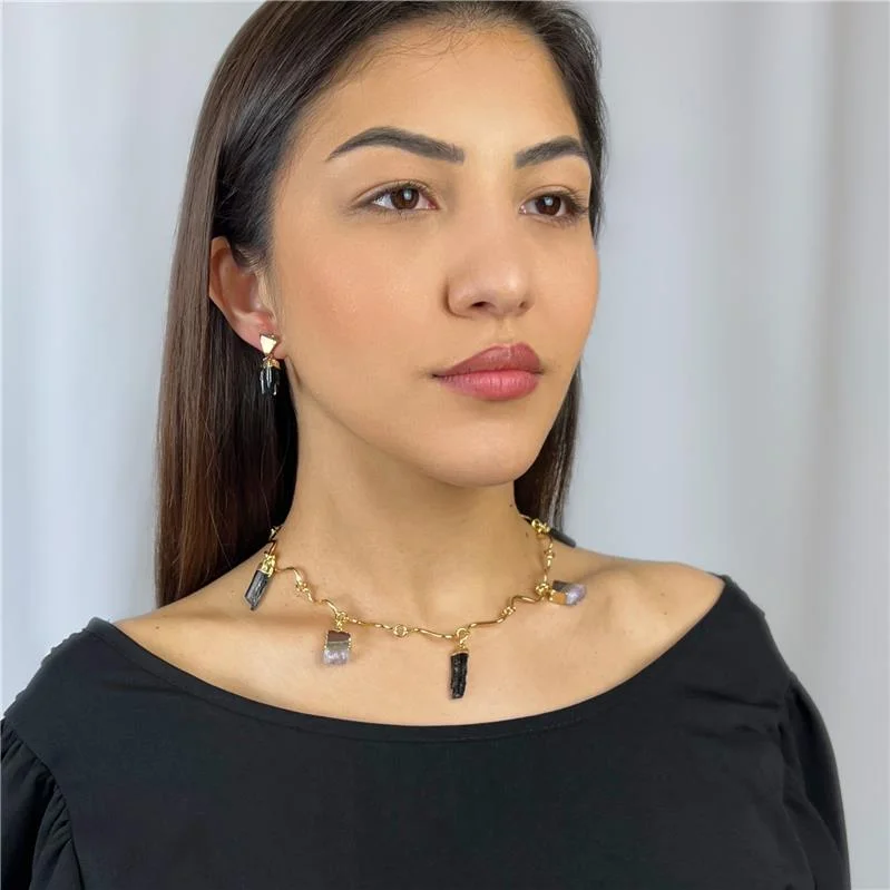 Colar Banhado a Ouro 18k - Pedras Naturais Turmalina e Geodo
