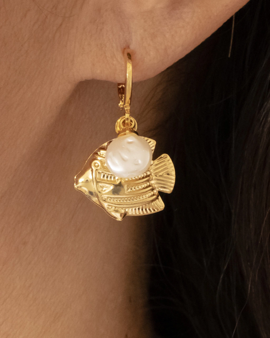 Brinco Argolinha com Peixe e Pérola Pendurada Banhado a ouro
